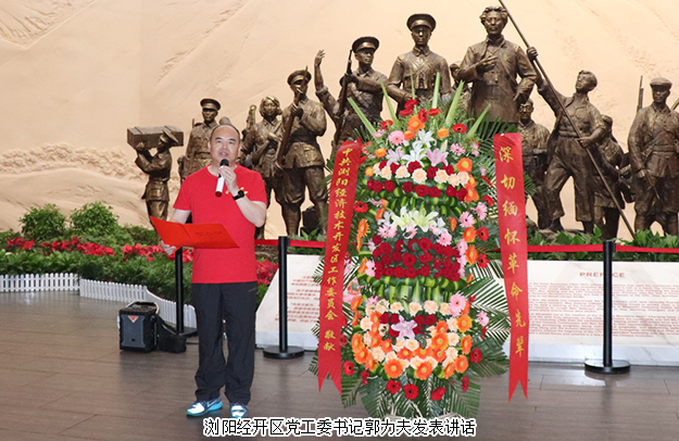 瀏陽經(jīng)開區(qū)黨群局局長陳飛雪主持啟動(dòng)儀式。儀式開始,瀏陽經(jīng)開區(qū)黨工委書記郭力夫在秋收起義紀(jì)念館前向革命烈士敬獻(xiàn)花籃,鞠躬致禮,深情緬懷革命英烈。隨后,瀏陽經(jīng)開區(qū)黨工委書記郭力夫?yàn)楸敬位顒?dòng)致辭。他在講話中說道,今年是秋收起義90周年,值此中國共產(chǎn)黨第十九次全國代表大會(huì)勝利召開之際,在這樣一個(gè)特殊的時(shí)間節(jié)點(diǎn)舉行“重走革命路”主題黨日活動(dòng)是希望黨員干部們能通過這樣具有紀(jì)念意義的黨日活動(dòng)在靈魂上得到洗滌、信念上更加堅(jiān)定,在今后的工作生活中時(shí)刻把革命先烈們的不屈精神內(nèi)化于心、外踐于行,以革命先烈為“鏡”,堅(jiān)持不懈提高黨性修養(yǎng),艱苦奮斗,為各自的工作事業(yè)再上一階梯更盡一份力。