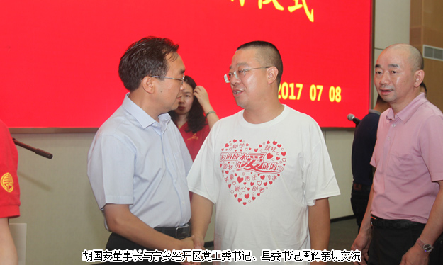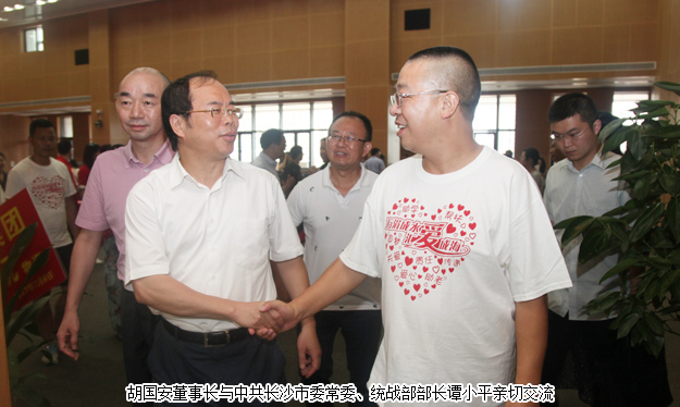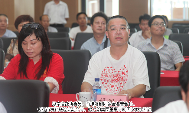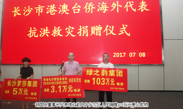 2017年7月8日,心連心、共命運——長沙市港澳臺僑海外代表抗洪救災捐贈活動在寧鄉(xiāng)舉行,中共長沙市委常委、統(tǒng)戰(zhàn)部部長譚小平,長沙市政協(xié)黨組織副書記、副主席石長松,中共長沙市委統(tǒng)戰(zhàn)部常務副部長劉映群,中共長沙市委統(tǒng)戰(zhàn)部副部長、市僑聯黨組書記王國平,中共長沙市委統(tǒng)戰(zhàn)部副部長、市臺辦主任袁義和等領導出席活動。湖南省政協(xié)委員、香港湘都同鄉(xiāng)會名譽會長、長沙市海外聯誼會副會長、綠之韻集團董事長胡國安,長沙市政協(xié)常委、香港長沙聯誼會執(zhí)行會長、善德集團董事長張曉琴,湖南省綠之韻公益基金會秘書長蔣文、副會長胡武安等與數十名長沙市港澳臺僑海外代表企業(yè)家共同參與活動,并通過牽頭募捐和以身作則,共籌集619余萬愛心款物深入寧鄉(xiāng)重災區(qū),希望幫助受災群眾早日重建家園、恢復正常生活秩序。
