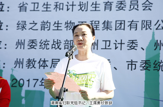 啟動(dòng)儀式上,中共湘西自治州州委副書記、統(tǒng)戰(zhàn)部部長(zhǎng)曹普華致辭:關(guān)愛女性健康,是各級(jí)黨委政府義不容辭的責(zé)任。湘西自治州將建立起政府主導(dǎo)、部門合作、醫(yī)療機(jī)構(gòu)實(shí)施、全社會(huì)參與的婦女“乳腺癌”和“宮頸癌”防治模式與協(xié)作機(jī)制,努力營(yíng)造全社會(huì)關(guān)愛女性健康的良好氛圍。綠之韻集團(tuán)作為我省著名的大型非公企業(yè),多年來(lái)積極承擔(dān)社會(huì)責(zé)任,大力開展賑災(zāi)濟(jì)困、興教助學(xué)等公益活動(dòng),得到了社會(huì)的普遍贊譽(yù)。這次,綠之韻集團(tuán)與省委統(tǒng)戰(zhàn)部、省衛(wèi)計(jì)委、省婦聯(lián)、省海聯(lián)會(huì)組織對(duì)湘西、懷化、益陽(yáng)三個(gè)市州的城區(qū)城鎮(zhèn)低保已婚婦女,開展3萬(wàn)例“兩癌”免費(fèi)檢查,又一次彰顯了綠之韻集團(tuán)強(qiáng)烈的社會(huì)責(zé)任感和樂(lè)于奉獻(xiàn)的愛心情懷。湖南省婦聯(lián)黨組書記、主席姜欣在講話中指出“兩癌”免費(fèi)檢查,既是民生項(xiàng)目,更是民心工程。項(xiàng)目的實(shí)施,表明了各級(jí)黨委政府健康脫貧的責(zé)任與決心,彰顯了社會(huì)各界助力脫貧的熱情與力量,體現(xiàn)了廣大婦女群眾對(duì)健康生活的追求與向往。希望廣大婦女學(xué)習(xí)健康知識(shí),提升健康意識(shí),做到健康與美麗同行;希望更多像綠之韻集團(tuán)這樣的愛心企業(yè)加入到健康脫貧的行動(dòng)中來(lái),為貧困患病婦女送去更多的溫暖與關(guān)愛。湖南省政協(xié)委員、省工商聯(lián)(總商會(huì))副會(huì)長(zhǎng)、省慈善總會(huì)副會(huì)長(zhǎng)、綠之韻集團(tuán)董事長(zhǎng)胡國(guó)安致辭,他向蒞臨活動(dòng)現(xiàn)場(chǎng)的各位領(lǐng)導(dǎo)、嘉賓,以及來(lái)自全國(guó)各地的“綠跑”愛好者、綠之韻家人們致以熱烈的歡迎和誠(chéng)摯的問(wèn)候。此次“兩癌”檢查救助暨公益“綠跑”,旨在將綠之韻發(fā)展融入到國(guó)家“健康中國(guó)”“精準(zhǔn)扶貧”戰(zhàn)略中,大力弘揚(yáng)健康向上、自信樂(lè)觀的生活理念,積極傳遞公益正能量,樹立起“健康+公益”的社會(huì)新風(fēng)尚。