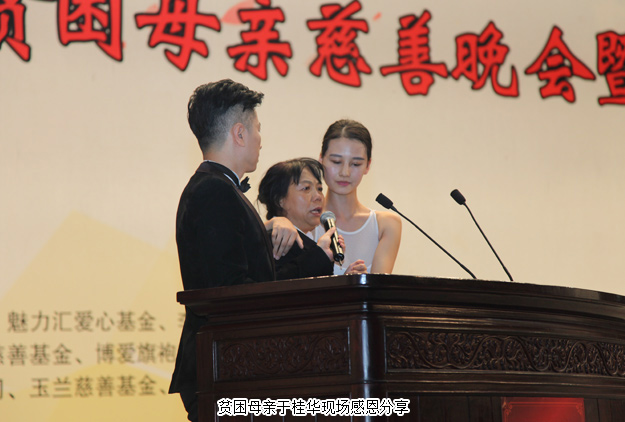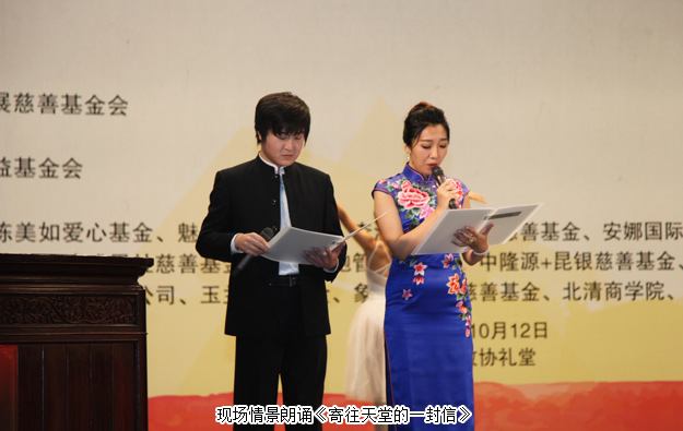 晚會(huì)現(xiàn)場(chǎng)情景朗誦《寄往天堂的一封信》讓現(xiàn)場(chǎng)觀眾凄然淚下。故事是根據(jù)吉林省貧困母親于桂華女士和女兒得大病至到女兒病逝的真實(shí)事件,在北京求助過程中得到了“關(guān)愛貧困母親”項(xiàng)目的大力幫助。于桂華來的現(xiàn)場(chǎng),她說目前最大的愿望就是回報(bào)社會(huì),感恩幫助過的好心人。