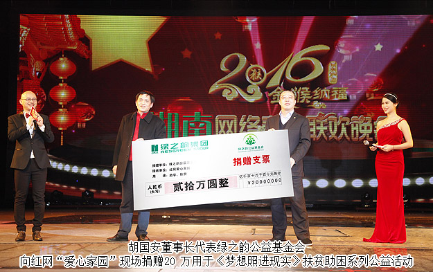 “國家把這么大一片山林交給我來守護,這是我的責任,也是我的榮幸。”從18歲到56歲,森林瞭望員余錦柱在江華瑤族自治縣尖子嶺堅守了38年,準確報告火警近300次,為國家挽回直接經濟損失3000多萬元。他說他最大的夢想除了保護好森林不被破壞之外,還希望能夠帶著家人去國外走走看看,綠之韻集團董事長胡國安被余錦柱的精神和夢想感動,晚會現(xiàn)場,特意為他送上了由綠之韻公益基金會提供的一萬元夢想基金,希望可以幫助他圓夢。除此之外,胡國安董事長代表綠之韻公益基金會向紅網“愛心家園”現(xiàn)場捐贈20 萬用于《夢想照進現(xiàn)實》扶貧助困系列公益活動,他表示:從綠之韻集團成立開始,就堅持生產綠色產品,晚會凸顯的“綠色、生態(tài)”主題,與綠之韻集團“綠色發(fā)展、生態(tài)文明”建設、“互聯(lián)網+三農產業(yè)”、“互聯(lián)網+公益”戰(zhàn)略完美契合,相得益彰!讓山川林木蔥郁,讓大地遍染綠色,讓天空湛藍清新……這是建設美麗中國的美好藍圖。綠之韻集團必將綠色環(huán)保理念傳遍祖國大地。