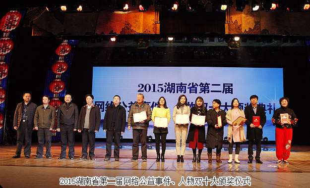 晚會現(xiàn)場還舉行了2015湖南省第二屆網絡公益事件、人物雙十大頒獎儀式。2015年,綠之韻集團攜手湖南經視聯(lián)合開展的《夢想照進現(xiàn)實》一對一幫扶活動,幫助了幾十名貧困家庭的學子、老人,助力他們實現(xiàn)夢想,得到了社會的廣泛好評。綠之韻集團《夢想照進現(xiàn)實》公益項目也因此獲得2015湖南省第二屆網絡十大公益事件,綠之韻公益基金會秘書長蔣文上臺領獎。
