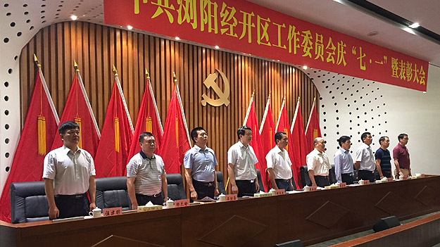 在莊嚴(yán)的國際歌聲中,大會開啟帷幕。首先,園區(qū)黨工委委員、紀(jì)工委書記楊圍山同志作了題為《適應(yīng)全面從嚴(yán)治黨新常態(tài)、推動黨建工作再上新臺階》的黨建工作匯報(bào)。他圍繞夯實(shí)黨建基礎(chǔ),切實(shí)履行黨建工作主體責(zé)任、著眼基層,有效推進(jìn)黨的基層組織建設(shè)、與時(shí)俱進(jìn),努力提升黨員干部隊(duì)伍素質(zhì)、踐行群眾路線,不斷增進(jìn)人民群眾血肉聯(lián)系、轉(zhuǎn)變作風(fēng),著力打造務(wù)實(shí)清廉執(zhí)政環(huán)境等五個(gè)方面闡述了如何狠抓創(chuàng)先爭優(yōu)。接著,園區(qū)黨工委委員、管委會副主任劉良成同志宣讀了中共瀏陽經(jīng)濟(jì)技術(shù)開發(fā)區(qū)工作委員會關(guān)于表彰2015年度先進(jìn)基層黨組織、優(yōu)秀黨務(wù)工作者和優(yōu)秀共產(chǎn)黨員的通報(bào)。