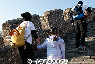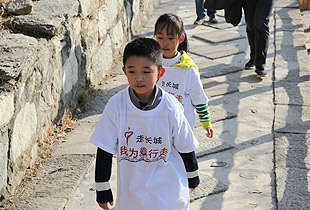 由于行進道路比較狹窄、坡度較大,大家三五成群,從慕田峪長城入口的中華夢石城出發(fā),沿著北步道,一路意志堅定,沿著幾里長陡峭的石階拾級而上,手拉著手歡呼雀躍地向著長城10號炮臺進發(fā)。在這條人流中,匯聚著綠之韻愛心經(jīng)銷商、公務(wù)員、知識分子、企業(yè)老板、務(wù)工人員、學生……他們彼此并不相識,博愛的名義卻把他們緊緊連在了一起。相識的、不相識的,大家揮舞慈善紅旗,以眼神鼓勁,用微笑問候,朝著一個共同的夢想、共同的愛心、共同的追求徒步前行。共沐大愛的心靈長河,誰人又不被感動呢?