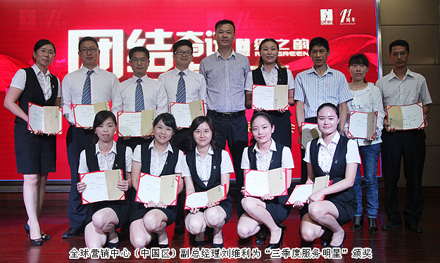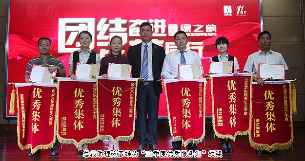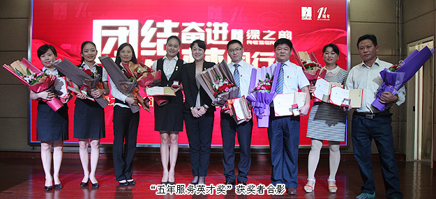 介紹了新晉高管及員工之后,會(huì)議最激動(dòng)人心的時(shí)刻還是屬于頒獎(jiǎng)環(huán)節(jié)。為表彰先進(jìn)典型,弘揚(yáng)企業(yè)文化,大會(huì)集中頒發(fā)了“三季度優(yōu)秀服務(wù)集體”、“三季度服務(wù)明星”、“五年服務(wù)英才獎(jiǎng)”、“十年服務(wù)忠誠(chéng)獎(jiǎng)”等獎(jiǎng)項(xiàng)。獲獎(jiǎng)部門(mén)代表、個(gè)人依次踏上領(lǐng)獎(jiǎng)臺(tái),享受大家的聲聲祝福和熱烈掌聲,共同分享此時(shí)此刻的快樂(lè)。本次大會(huì)上,業(yè)務(wù)服務(wù)部、公共事務(wù)部、湖南分公司、保安組、日用品制作組喜獲“三季度優(yōu)秀服務(wù)集體獎(jiǎng)”,侯俊霞、陳敏、趙蕾、湛亮、楊恬、阮毅、李恒華、文冰、盧再琳、李明、伍成輝、楊會(huì)英、鄒建華、肖巧林、胡國(guó)純、胡樹(shù)峰、趙潔、費(fèi)陽(yáng)、曹葉、樊俊杰榮獲“三季度服務(wù)明星”殊榮;王芬、陳敏、周洋、高芳、李明、雷竹蘭、黃付行、侯立新、黃繼民、王麗、梁涌、李哲、呂晶榮膺“五年服務(wù)英才獎(jiǎng)”,董事常務(wù)副總裁勞嘉上臺(tái)頒發(fā)了香港周大福珠寶公司特約設(shè)計(jì)師量身定做的、鐫刻獲獎(jiǎng)?wù)呙值淖憬饦s譽(yù)徽章和獎(jiǎng)金;許達(dá)仲、馮紅、黃莎莎、王艷、許鵬翔、王興良榮膺“十年服務(wù)忠誠(chéng)獎(jiǎng)”,不僅收獲了全體綠之韻人的祝福和尊敬,還榮獲了60萬(wàn)元購(gòu)房補(bǔ)貼金、10萬(wàn)元企業(yè)年金獎(jiǎng)勵(lì)金、2萬(wàn)元的家庭帶薪旅游基金和由香港周大福獨(dú)家設(shè)計(jì)的金銀幣紀(jì)念獎(jiǎng)?wù)隆?/span>