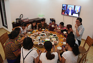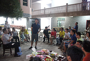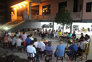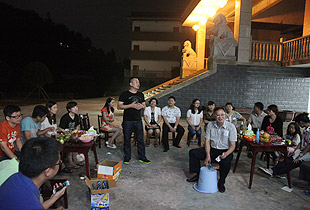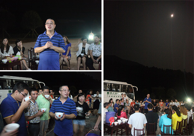 中秋圓月當(dāng)空照,綠韻山莊話家常。吃完晚餐,大家圍坐在寬敞的前坪,一場中秋月圓之夜的茶話會激情上演。大家暢所欲言地交流,伙伴們精心編排的“小蘋果”激情舞動,氛圍無比融洽。中醫(yī)養(yǎng)生專家、湖南中醫(yī)藥大學(xué)李定文教授為大家?guī)砹恕安枧c人生”、“茶與健康”的精彩講演;公司常年法律顧問尹湘南律師根據(jù)自己兩天來的親身體驗,暢談了心中所想、所思、所悟。隨后,大家開始玩起了“擊鼓傳花”的游戲,誰接到鼓聲停止的那一棒就即興表演節(jié)目,有的清唱山歌,有點翩翩起舞,有的講起笑話,有的表演小品,其樂融融,親如一家。茶話會上,胡國安董事長深情滿懷地說:“我家門前的小九溪,從著名的雪峰山深處走來,拐個彎又不知疲倦地往外面的世界奔去。沿著這條小溪,我走過了童年、少年,明白了在群山之間蜿蜒奔流的小九溪的夢想,明白了小九溪晝夜不舍奔向浩瀚汪洋的意義。我想,一個人、一支團隊或者一個企業(yè),如果能夠像小九溪一樣,堅韌執(zhí)著于夢想,不畏萬難咬目標(biāo),何愁不能成長、發(fā)展,乃至基業(yè)長青呢?這一次邀請優(yōu)秀黨員、員工來到我的家鄉(xiāng)做客,就是想讓大家深刻領(lǐng)悟‘水的精神’、‘家文化’的根本,切身明白‘綠之韻水的精神和家文化’存在于諸位人生、綠之韻發(fā)展中的重要意義。”