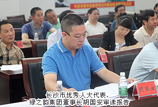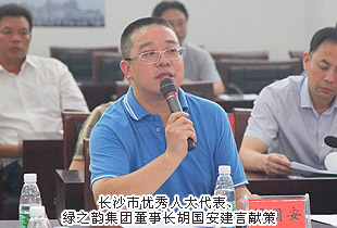 2014年7月29日,長(zhǎng)沙市“一府兩院”向市人大代表瀏陽聯(lián)組通報(bào)2014年上半年工作會(huì)議在瀏陽市政務(wù)服務(wù)中心成功舉行。長(zhǎng)沙市第十二屆人大常委會(huì)主任楊順初,長(zhǎng)沙市人大常委會(huì)副主任趙建強(qiáng),長(zhǎng)沙市人民政府副市長(zhǎng)、瀏陽市委書記曹立軍,長(zhǎng)沙市中級(jí)人民法院副院長(zhǎng)黎軍,長(zhǎng)沙市人民檢察院副檢察長(zhǎng)祝珍明,長(zhǎng)沙市僑聯(lián)主席翁少蘭,中共瀏陽市委副書記、市人民政府市長(zhǎng)余勛偉,瀏陽市人大常委會(huì)主任魯建文等領(lǐng)導(dǎo)蒞臨現(xiàn)場(chǎng),長(zhǎng)沙市優(yōu)秀人大代表、綠之韻集團(tuán)董事長(zhǎng)胡國安受邀出席,并在會(huì)議上發(fā)言。