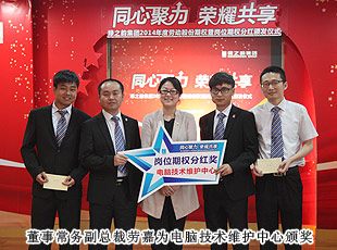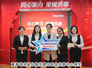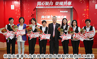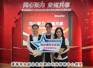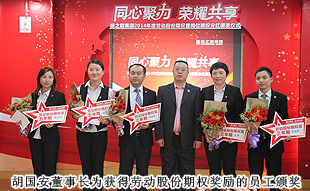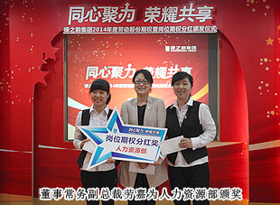 通過學(xué)習(xí)和借鑒,適時引入“勞動股份期權(quán)”這一前瞻性概念,并付諸于一諾千金的主動性企業(yè)行為,是綠之韻在其發(fā)展過程中區(qū)別于其他企業(yè)的顯著標(biāo)志,也是本次頒獎大會上最重大的亮點(diǎn)。“綠之韻模式”的勞動股份期權(quán)獎勵機(jī)制,始于2011年,分為勞動股份期權(quán)(三年期)和勞動股份期權(quán)(五年期)兩種形式,兌付方式分為一次性兌付和逐年兌付兩種方式,開創(chuàng)了直銷企業(yè)主動將企業(yè)價值與普通員工共享的里程碑式先河。在全場熱烈的掌聲中,胡國安董事長親自為獲得2014年勞動股份期權(quán)獎勵的員工頒發(fā)了獎勵,并逐一合影留念。