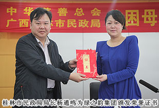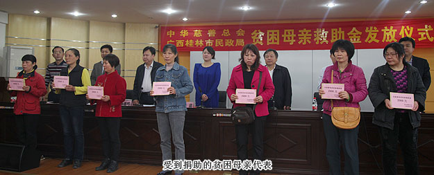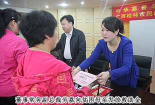 2014年4月11日,“關(guān)愛貧困母親,讓愛綻放”——中華慈善總會(huì)貧困母親救助綠之韻愛心行動(dòng)第三站走進(jìn)廣西桂林,為100名特困母親捐贈(zèng)20萬元愛心善款。中華慈善總會(huì)秘書長邊志偉、募捐部主任蘇輝、廣西慈善總會(huì)常務(wù)副會(huì)長陳利丹、秘書長陳克富等領(lǐng)導(dǎo)出席活動(dòng)。綠之韻集團(tuán)董事常務(wù)副總裁勞嘉、全球營銷中心華南區(qū)業(yè)務(wù)總監(jiān)兼廣東分公司經(jīng)理梁涌帶領(lǐng)吳季峰、葉海蘭、楊帆等綠之韻愛心志愿者為愛行動(dòng)。