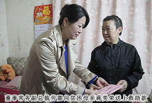 貧困母親蔣美榮,去年12月被檢查出患有惡性腦腫瘤,喪失勞動(dòng)力。丈夫2002年因車禍去世,獨(dú)自撫養(yǎng)還只念初一的雙胞胎女兒,一家人擠在一間30多平方徒有四壁的小房子里,沒有經(jīng)濟(jì)來源,只能靠社區(qū)的救濟(jì),巨額的手術(shù)化療費(fèi)用和女兒的學(xué)雜費(fèi)用,讓這個(gè)家陷入絕境……看到這一切,綠之韻集團(tuán)董事常務(wù)副總裁勞嘉說:我的心就像被緊緊地揪在一起,生生地疼,我們現(xiàn)在能做的和以后要做的,就是讓企業(yè)強(qiáng)大,讓社會(huì)參與,共同扶貧濟(jì)困。說完這番話,只見她偷偷抹掉眼角的淚水,微笑著為這個(gè)家送上了慰問金和救助物資。