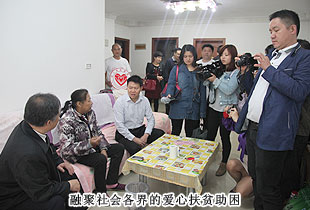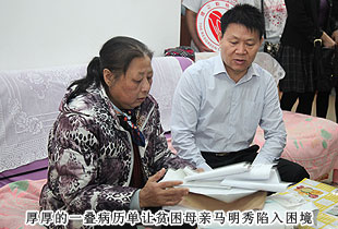 貧困母親馬明秀,患有尿毒癥,丈夫同樣身體抱病,一摞厚厚的病歷單成為這個(gè)家庭最刺眼的標(biāo)簽。桌子上各種各樣的藥罐子,是每月2000多醫(yī)療費(fèi)用的產(chǎn)物,當(dāng)失去了經(jīng)濟(jì)來源,生的希望就無情地熄滅了。可是,當(dāng)迎來慰問隊(duì)伍,收到各界的關(guān)懷之后,馬明秀說:“我曾經(jīng)失去過活下去的勇氣,但是社會(huì)各界的關(guān)心,讓我又擁有了對(duì)抗病魔的勇氣,我一定會(huì)好好活下去,帶給家人和社會(huì)精神上的正能量?!?br/>