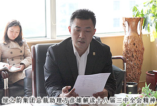 會上,綠之韻集團總裁助理方彥雄組織全員學習了《中國共產(chǎn)黨第十八屆中央委員會第三次全體會議公報》原文,詳細介紹了十八屆三中全會召開的背景、時間、指導思想、總體目標、重點任務(wù),進一步明確了黨的十八屆三中全會是在我國改革開放新的重要關(guān)頭召開的一次重要會議,是全面深化改革的又一次總部署、總動員,具有重大而深遠的影響。