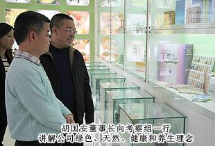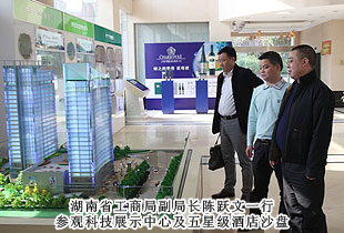 考察過程中,湖南省工商局副局長陳躍文、湖南省網商協(xié)會秘書長一行首先參觀了綠之韻集團總部、產品展示廳和科技展示中心及五星級酒店沙盤。胡國安董事長就公司產品、產學研合作、公益慈善和未來規(guī)劃等相關情況進行了簡短介紹,各位領導邊走、邊聽、邊仔細詢問,頻頻點頭以示高度肯定和贊許。