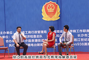湖南省打擊傳銷工作聯(lián)席會議辦公室主任、湖南省工商局副局長魯先華,湖南省打擊傳銷工作聯(lián)席會議辦公室副主任、湖南省經(jīng)濟檢查總隊總隊長毛愛倫,湖南省經(jīng)濟檢查總隊副總隊長肖向陽,長沙市工商局黨組書記、局長卓精華,長沙市工商局黨組副書記、副局長潘虹,長沙縣人民政府副縣長、公安局長曾衛(wèi)國,長沙縣工商局黨組書記、局長舒曲等領(lǐng)導(dǎo)和嘉賓蒞臨活動現(xiàn)場指導(dǎo)。綠之韻集團受邀參與此次活動,湖南分公司代表、高級經(jīng)銷商蘇龍輝先后與主持人、居民朋友進(jìn)行一問一答式互動,贏得了現(xiàn)場陣陣熱烈的掌聲。